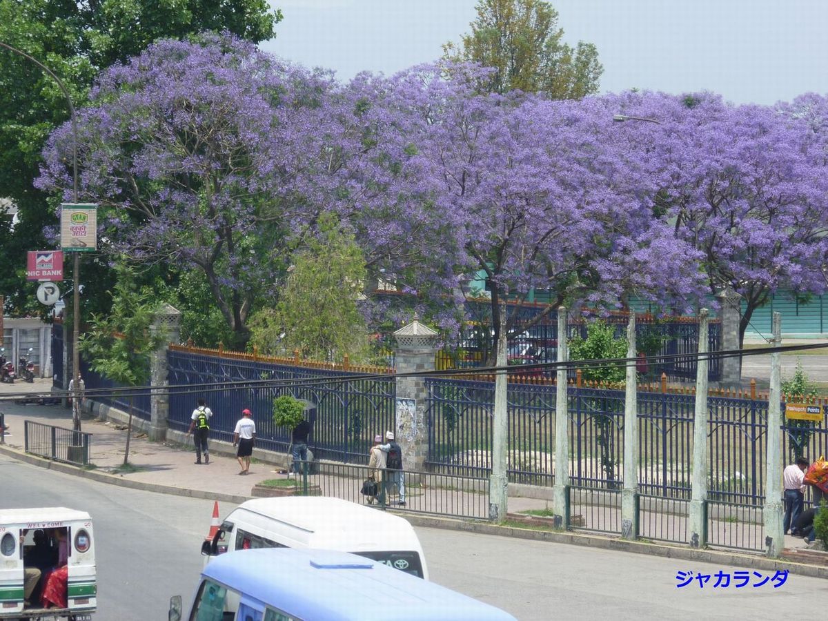 | 五月カトマンズはジャカランダの花に覆われます。上の写真はトウンディグル広場のジャカランダ、ラトナパークの南です。 5月6日カトマンズ観光の続きになります。 12時少し前にパシュパテナートからタクシーに乗ったのは良いが、伝えた所と違う所へ下ろされます。英語が通じてなかったようです。ハンドブックの地図を頼りに現在地を確認すうるも、どこなんや?って感じで聞けそうな人も見あたらない。アンナプルナホテルと言えば良かったかな。タクシードライバー氏はサウス・ゲートでは判らない。 歩道橋が有るのでそこまで歩いて上から現在地確認、時計台が北に見えますから北に向かって歩けばいいと云う事です。歩道橋を降りて、ミニバスの停留所を右に左は大きなデパートメント・カスタムみたいです。再度歩道橋を東へ渡るとジャカランダがまじかに見える。花を愛でながらアンナプルナホテルまで歩いて行く。探してやっと古都へ着くと営業時間が午後3時〜6時の張り紙、がっかりです。 でも沢山のジャガランダを見られて良かった。 |