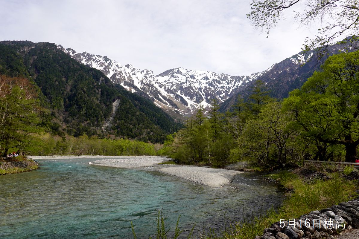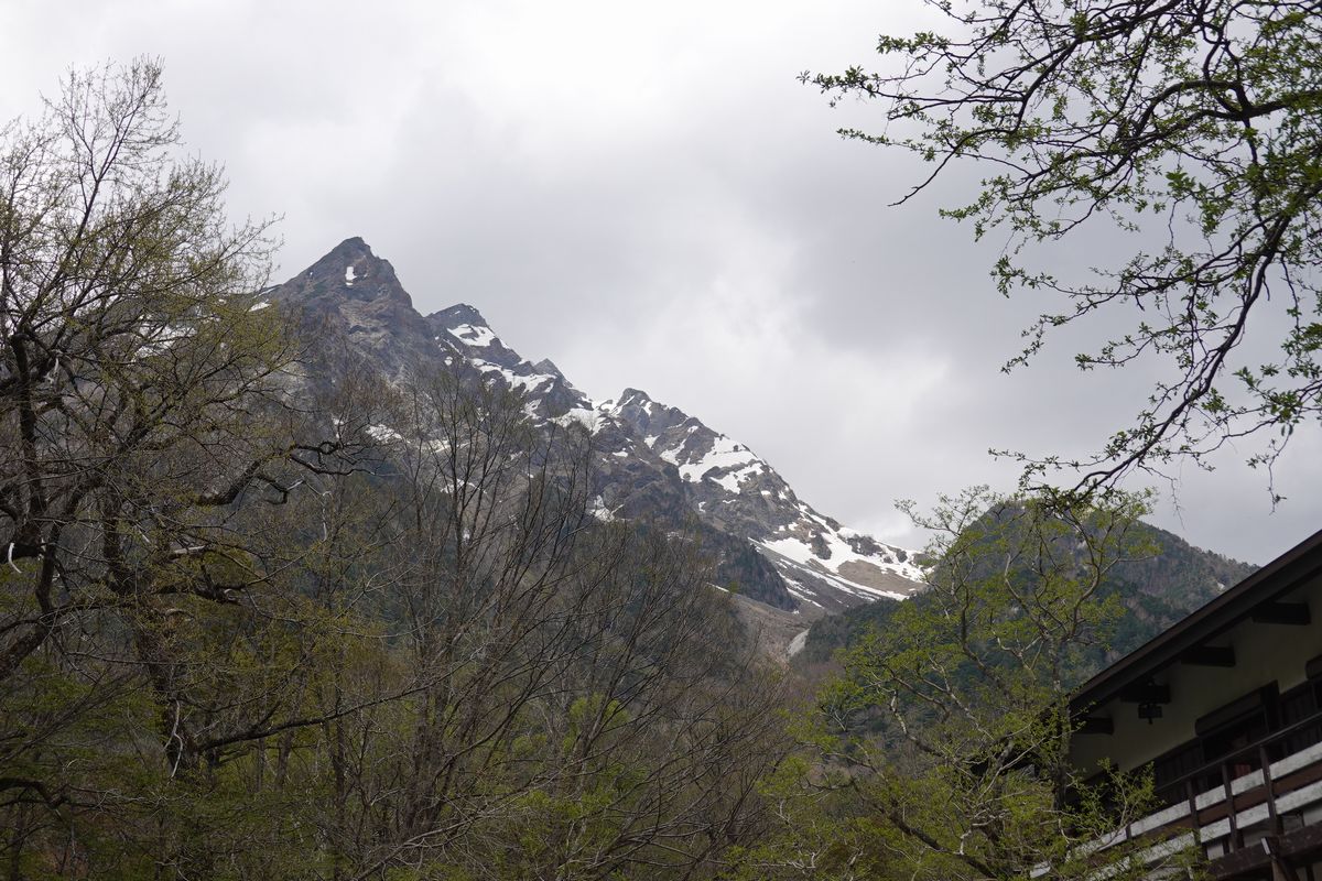 | 5月16日上高地。天気予報見て土日は雨曇りだ、ならばキャンプ場は左程混まないと出発。テント張ってから明神まで行く。吊尾根の雪も例年より多いな白部分が多いわ。17日が大雨強風で18日の画像と見比べると少し雪減る。 |