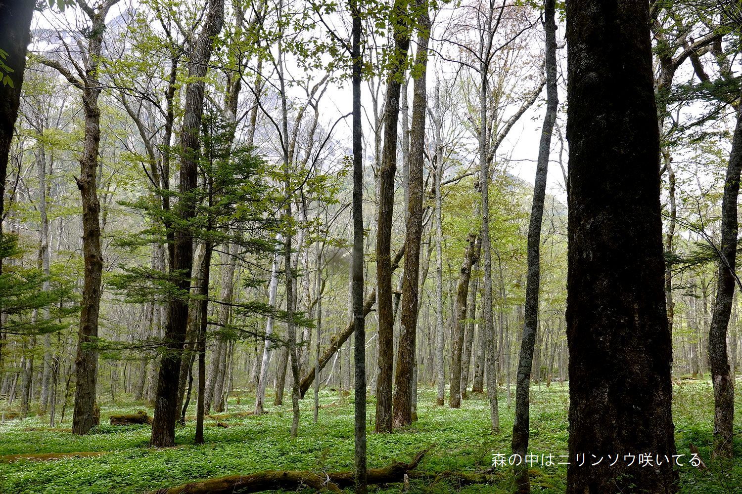 | 天候:高曇り後明神過ぎてパラパラ来た。 明神までテクテクと。ニリンソウの緑花捜し、ツバメオモトも咲いてる。ハシリドコロやミヤマカタバミも良く咲いてる。ごく少し色付いてる緑ニリンソウ有った。明神五峰の見える所で諸々の思い湧いて眺めます。昔明神五峰ルートで固定ロープを3本か4本ほど上がった辺りで上部が更に急峻になる。そこの岩と樹の見晴台で真下に上高地や帝国ホテルの赤屋根を眺める。フト帰路ヤバい、すでにバテテるのを自覚して折り返した事が有った。 |