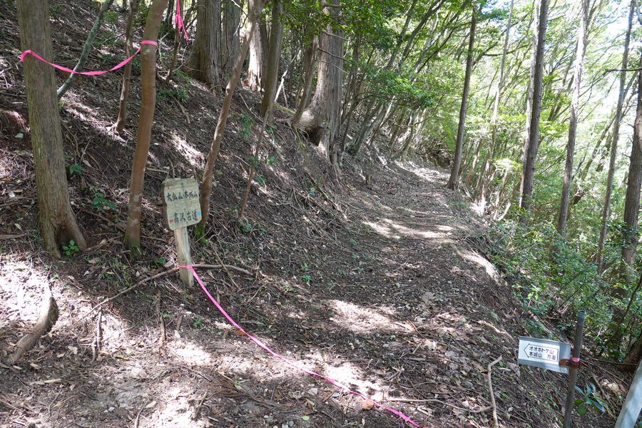 | 山へ入り高沢古道を進みます、ある程度坂道を上がって行くと次第に緩やかな道になって行く。途中汗かいたなと思う頃に高澤山の分岐標識あるので御嶽山を見に行く。山頂日差しが辺り暑い樹の陰へ。御嶽山は裾野が見えるけどすっぽり夏雲の中です。あれッ乗鞍岳は見えるな。冬と違い青緑・緑してます。 |